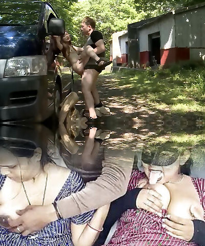 Horny model in sexy tights into car sex outdoors