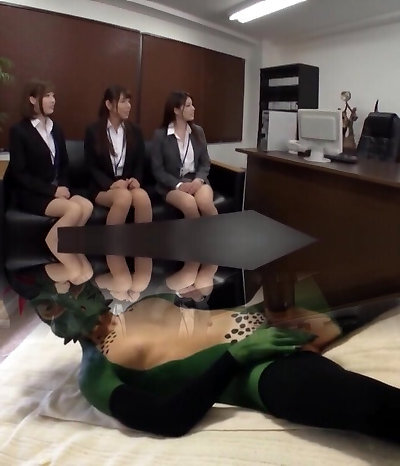Three hot Japanese office employees giving their boss a footjob